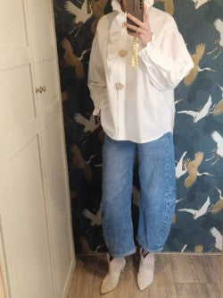 Deze blouse is vrouwelijk, verfijnd en echt zo’n item dat je outfit meteen bijzonder maakt. De ruffles en ballonmouwen geven een zachte, romantische uitstraling, terwijl de gouden broches zorgen voor een opvallend detail.